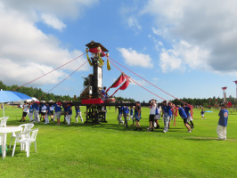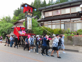 朝5時過ぎに起き、パソコン作業。7時過ぎからはトウモロコシを蒸して、梨をむいて学生諸君が起きてくるのを待つ。朝食を済ませて、9時過ぎには出発、セミナーハウス山びこに立ち寄り、不動寺公民館を目指す。放牧場横の道が通行止めになっており、駒渡から松波方向に向い、戻るようにして不動寺へ。公民館に学生諸君の荷物を運び入れ、1階の冷房の効く部屋で館長からお話をうかがう。地震の際に多くの人が避難した体育館も見学。集会所も見学、横にはキリコが組み立てられていました。一旦公民館に戻り昼食。好意で用意いただいた赤飯、茶碗蒸し、酢の物、煮物、だご汁もご馳走になりました。午後2時前には集会所に移動。神事が行われた後、いよいよキリコを担いでの巡行です。能登町定住促進協議会でインターンシップをしている学生さん3名や森さん、スタッフ2名も参加していました。地区を一通り回りますが、途中休憩をはさみつつ、集会所に戻ったのは18時前でした。学生諸君は、温泉に入りに行きましたが、中央大生と当方は能登事務所にもどる。中央大生はシャワーを浴びて、寝られる準備をして不動寺へ。当方は金沢に戻る。20時に徳田大津を通過しましたが、夜間の通行止めは9月1日から19日までとのこと。 | ![]() 不動寺の祭り |