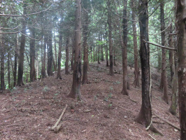 5時過ぎに金沢を出て、宝達志水町上田出の家の納屋からチェーンソーと刈払機を車に積む。7時半前に鵜野屋に到着。安成寺の坊守に予定を伝えた上で、地保集落の裏山に上がりました。白髭神社の鳥居横の小川を越えて竹林を上がる。お墓が複数ありましたが、地震で傷んでいました。墓のそばに地割れがあり、修復が必要ですね。そこからさらに上がって参りましたが、少し上がったところにも地割れがありました。集落の住宅に崩落していくような場所ではない印象です。邪魔な枝をカットしながらゆるやかに上るルートを作ってまいりました。アテ林の手前に大きな地割れがありましたが、集落とは反対側にあります。アテ林は一番高い位置にありますが、残念ながら漏脂病にかかっている木が多い。一度森林組合の方にチェックいただくのがよろしいかと思います。そこから集落側に少し下ったエリアは竹林で、除伐を予定しているエリアには赤いテープが張ってありました。竹林を下りたら集落の真ん中に下りましたが、右側にある林道を上がってみましたが、途中に倒木がたくさんあり、奥に進むことはできませんでした。アテ林に登るためには、橋のたもとから上がるのが良さそうでした。一旦安成寺で着替えて休憩させていただき、富来へ昼食を食べに出る。午後は、和田の西浦さんのところに立ち寄り、相談。再度鵜野屋に行き、今度は安成寺の裏山の上流側の山裾を先日草を刈った先に進む。チェーンソーを使って倒れていた木を2本切り、通りやすくして、登りやすくする。さすがに疲れてきたので、早めに作業を終えて、安成寺で再度着替えて、金沢に戻リ始めたところで、電話があり、急遽能登事務所へ。穴水のホームセンターで物干し台を購入し、能登事務所2階に設置。洗濯したシーツ類を干して戻る。 | ![]() 地保の裏山のアテ林 |