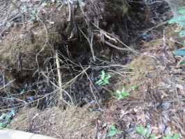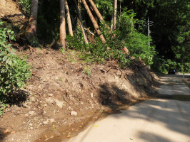 早朝に金沢を出て能登へ。7時過ぎには鵜野屋に着き、上流側から安成寺の裏山に上がる。とりあえず前回と同じコースを通るが、現状ではこのコースが良さそうです。一番高い場所と手前の広がりのあるスペースを楽しめるように広げられるとよいかもしれません。下りは前回上ったルートを通るが、下りやすそうでした。安成寺で着替えさせていただき、報告。土曜日も再訪させていただきます。能登事務所に移動し、客人の到着を待つ。10時半過ぎに来られたのは東洋大と昭和女子大の先生でした。次年度のゼミ活動に向けて、いろいろ情報提供をさせていただく。昼食を柳田の8番らーめんでご馳走になる。先生方とはここで分かれ、関西大の学生さんを桜峠の道の駅に案内。少し時間があったので、大箱集落を通り、鉢伏山の林道に入ってみたが、すぐに通れなくなっていました。次に北河内集落に行き、紺谷さんを訪ねる。お元気そうで安心しました。夕方早めに、学生さんを町野のもとやスーパーに送り届け、金蔵経由で戻る。能登事務所に戻り、掃除機を掛け、ゴミ類を車に積み金沢に戻る。 | ![]() 大箱集落での斜面の崩落現場 |