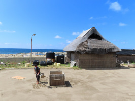 朝9時にはセミナーハウス山びこに学生さんを迎えに行く。まずは町野のもとやスーパーで買い物。金蔵へ向かう山が崩落している現場に案内。10時には、曽々木の刀祢さんのご自宅にお邪魔して、漁業についてのお話をうかがう。12時にお暇し、ここで解散。中央大の学生諸君8名は金沢に向かい、当方は関西大の学生さんを伴い珠洲を巡る。まずは、角花家の塩田へ。塩田作業は進めておられますが、釜屋が壊れたままで、塩づくりはできていません。職人さん待ちのようです。塩田村にもお邪魔して、塩田、釜屋、展示を拝見。塩田で浦さんから話をうかがう。塩ソフトもいただきました。展示館で上映されていた映像は、角花家の塩づくりの様子でした。もう一度角花家に戻り、砂を集める作業の様子を撮影。北上し、大谷地区の土砂で埋まったエリアを案内。つばき茶屋にお邪魔して、心地よい自然の風を浴びながらドリンクをいただく。次にみなくち農園のスイカ畑にお邪魔。小玉スイカは不作のようです。正院や宝立の家が無くなったエリアを通り、見附公園駐車場で行われていた「宝立七夕キリコまつり」の様子を拝見に。地震、津波、豪雨に見舞われても生き残ったキリコが一台組み立てられて展示されていました。帰りにスーパーしんやで買い物をしてもらい、能登事務所へ。洗濯してあったシーツ類を干して、当方は金沢に戻る。 | ![]() 角花家の塩田作業 |