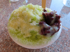 朝9時にはケロンの小さな村に行き、2つのチームに分かれて活動。1チームは拓夢さんと森の保全作業を、もう一つのチームは当方が担当し、昨日の続きで水源を目指すルート整備を進める。11時前まで作業を続け、溜池と思われる場所に辿り着きました。水はたまっていませんでしたが、端にヨシが生えていて、点々と水が浮いている地点がありました。作業はそこまでで終えて戻る。昼食はピザをお願いしていたので、順番が来るまで時間がありそうでしたので、先生と二人で能登事務所に戻り、シャワーを浴びて着替えて戻る。ちょうど、ピザの準備をしていただいていたので、ご馳走になりました。かき氷もいただく。あずきもトッピングしていただき美味しかったです。午後は拓夢さんから話をうかがうが、途中から由姫乃さんにも加わっていただき、意見交換。良い機会でした。1時間半ほど話をして終了。スーパーしんやで買い物をして戻り、早めに先生と飲み始める。学生諸君が料理を始める頃には、2階に上がり休憩。学生諸君の夕食が始まる頃には、女子たちもセミナーハウスでの食事を終えてやってきて一緒に飲んでいましたが、早めに帰る。 | ![]() ケロンでいただいたかき氷 |