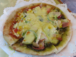 朝早くに起きだし、7時過ぎには鵜野屋に到着。刈払機で安成寺の裏山へのルートづくりのために上流側の山裾の草を刈ってみました。途中で伐採した竹の山に遮られ断念。次回は何とか水源近くまで行くルートを探れればと思う。9時過ぎには安成寺でシャワーを浴びさせていただき、県立大の先生の到着を待つ。学生さん2名も一緒に来られ、10時過ぎから、安成寺の裏山に上がり、亀裂調査。あちこちにあるので、きめ細かく調べていただきました。山を下りて、安成寺で少しお話をうかがう。11時半には鵜野屋を出発し、ケロンの小さな村へ。こちらでも、森に分け入り、亀裂が入った地点を確認していただく。横に走っている亀裂は以前から確認していましたが、新たに縦に入った亀裂も発見しました。下界におり、米粉ピザをいただき、解散。後日、レポートをいただける予定です。 | ![]() 米粉ピザ |