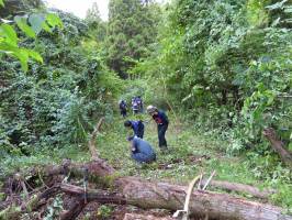 朝8時半に能登事務所を出てケロンの小さな村へ。上乗夫妻に本日の中央大生の活動について確認。9時には学生諸君が到着、2グループに分かれて活動。4名は滞在しているセミナーハウス山びこの隣の家の家財の移動の手伝いに入ったので、午前は10名で活動。薪割4名、水源への道の整備6名で活動。水源チームはまず、前回の中央大生の活動で辿り着いた溜池を見学に。水が多く浮いている感じでした。そこから林道を広げる作業を行い、小川沿いのルートに下りずに、林道を歩けるように広げて、途中で午前の作業は終了。11時半過ぎからは米粉ピザづくりを体験してもらう。家財移動手伝いチームも到着し、5名×2+4名で体験。サポートについている大人4人分は4種のピザをお作りいただいたので、異なる味を順番に楽しむ。午後も水源への道整備と薪割を続け、全員が薪割を体験。水源への道も林道を歩いて行けるようにできました。入口付近の木はあえて残してあります。将来、ガイドツアーをケロンのスタッフで催行いただければと思うので、水源エリアはガイド付で行く場所にできればと勝手に構想しています。水辺に下りられる道や棚田跡も見学できるようにルートを設けられればと思います。森全体が水源とも言えるので、そのようなことを体感できるフィールドとガイドツアーになると良いですね。終了後、当方は谷下教授と能登事務所に戻り、着替えて私だけは金沢に戻る。 | ![]() 水源への道を広げる |