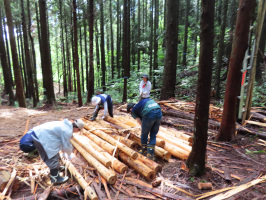 午前早めに買い物をした後、能登に向かう。穴水で買い物をして、輪島市三井ののと復耕ラボへ。すでに谷下教授と弊社の今井さんは到着しており、茅葺庵の中を見学させてもらう。間もなく中央大学ボランティア参加学生14名が到着。のと復耕ラボ代表の山本亮さんによるオリエンテーションの後、3つのグループに分かれて、ソラクマ倉庫づくり、古材アクセサリー部品づくり、森づくりで活動。当方は森づくり活動チームに同行。伐採し適当な長さで切られた材木(アテ、スギ)の皮むきを行う。途中休憩を何度もはさみながら、午後3時半過ぎまで行う。最後は長さ8mの製材機械を入れる建物に使う杉材の皮をむく。終了後、学生諸君はめだか交通のバスでコンビニ経由でセミナーハウス山びこに移動するが、当方と先生は能登事務所に移動し、着替えてからスーパーしんやへ買い物に。シャワーを浴びて、食事の準備をして早めに飲み始める。滞在中の学生さんも交えて長い夕食でした。雨の後の能登事務所は涼しかったです。 | ![]() 木の皮むき |