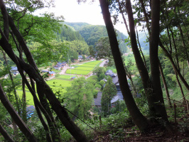 朝5時過ぎに金沢を出て志賀町鵜野屋へ。7時過ぎに到着、安成寺の裏山へ下流側から登ってみる。途中で歩くルートを見つけ、蛇行しながら上がるルートを探しつつ行く。早い段階で、眼下に鵜野屋や地保の集落を見下ろすポイントがありました。頂上エリアの手前にも眺望ポイントがありました。斜面に亀裂が入った場所が複数あります。補修の仕方は要検討です。頂上エリアから反対側に下りようとしましたが、先日登ったルートは急に感じたので、別のルートに挑戦するが、谷の部分に積みあがった除伐竹で歩行が難しく、やっと出て来ることができました。次回は違うルート探しをしたい。可能なら竹を動かすか砕く作業ができればと思う。安成寺でコーヒーをご馳走になりながら、相談。能登事務所に移動し、滞在中に学生さんとケロンの小さな村へ。月末の活動などについて確認。その後、ござれ祭りが行われる柳田植物園へ。開始まで時間があったので、満天星の図書室で本を見ながら休憩。15時頃に再度会場の芝生広場へ。出店者も営業されていて、キリコを担いでの巡行も行われていました。ステージでの子どもたちの太鼓披露や歌手の皆さんのステージも続いていました。お店で買い物をして、ドリンクを飲みながら楽しませていただく。料理人の玄田さんや元町長の持木さんにもお会いすることができました。早々に会場を後にして、スーパーしんやで買い物をしてもらい、能登事務所に送り届けて、当方は金沢に戻る。 | ![]() 鵜野屋の森からの眺望 |