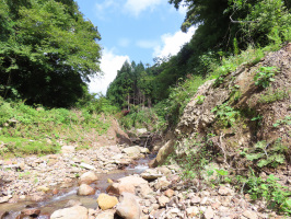 早朝暗いうちに起きだし、日本大学の学生諸君のためのペーパーを作成し先生にメール送信。朝8時過ぎには能登事務所を出て北河内へ。光明寺の竹橋住職にルートを教えていただき、鉢伏山への林道を歩く。何箇所も崩落が発生していて車では行けませんので、いぼ地蔵の駐車場に車を置いていく。すぐに大きな崩落があり、大木が折り重なっていますので、間を縫うようにすすむ。その先にも同じような箇所が点在していますが、それ以外は林道なのでフラットな道に草が生えています。草刈り機で刈りたいところですが、その前に倒木の処理が必要かもです。かなり進んだところで、橋が落ちていて、急な斜面を斜めに下り、川を越える。分岐があり、ここで判断を間違え、右に進んでみたのですが、さらに橋が落ちている地点から少し行ったところで、細い竹が密に生えていて、これ以上進むと帰れなくなりそうだったので、体力が残っているうちに引き返す。住職に再度確認したところ、落ちていた橋の先は左手を真っすぐに進むのがよろしいとのことでした。次回はそちらにアプローチしたい。これでルートの確認ができたので、探検隊を行うことも可能そうです。事務所に戻り、シャワーを浴びて買い物に。早めに夕食を食べて早めに寝る。 | ![]() 鉢伏山に向かう林道の橋が崩落した場所 |