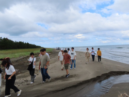 6時半には家を出て能登事務所へ。のと里山海道は多くの車が走っていました。能登事務所でセレクトした写真を出力。9時半には事務所を出てのと里山空港へ。定刻で着いた午前便で、日本大学の学生さんや先生が到着。学生諸君には早めの昼食をとっていただくことにして、先生とNOTOMORIで打合せ。11時過ぎには、空港の到着ロビーで先生が参加者の確認を行いバスへ。まずは見附島へ。島を拝見した宝立地区を歩いてみて回る。空き地ばかりになったところで、一人草むしりをされているお母さんに声を掛けてみるが、宝立小中学校近くの仮設にお住まいとのこと。結構距離があるので、心配になる。家族で空き地になった家の場所の草刈りに来ている方もおられました。橋を渡り、建物の少なくなった通りを歩き本町ステーションへ。宝立かるたづくりの最終日で、本日完成し、かるた大会を行われるとのこと。中野区からちんどんチームがお越しで、ボランティアで活動を盛り上げるための宣伝活動を行っておられるようで、仮設団地に向かって歩いて行かれました。鵜飼駅に待機いただいたバスに学生諸君には乗っていただき、当方は見附の駐車場に歩いて戻り、道の駅すずなりへ。買い物休憩となっていたので、塩ソフトを試してみた。次にビーチホテルへ移動し、ここから鉢ケ崎海岸を歩き、蛸島町の途中に上がり、住宅街を歩いて戻る。鍵主工業の看板前で全員の写真を撮影。ビーチホテル前でバスを見送り、当方はフードはまおかで買い物をし、さらに、多間栄開堂で太鼓万頭などを買い物して戻る。最後にケロンに小さな村を訪ね、上乗さんと月末、月初の活動について相談。 | ![]() 鉢ケ崎海岸を歩く |