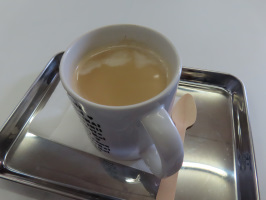 本日も早朝に起き、フィールドワークの準備。資料を修正し、ネームプレートを作成。大学名と学部名だけを入れて、一番下に名前を書けるスペースを設ける。首から下げるひも付きが16人分ありましたので、宇出津の文具店で追加することに。朝8時半前に能登事務所を出て、宇出津の文具店・千間啓文社で名札入れを購入。珠洲に移動し、わくわく広場で、名札づくりをさせていただき、スタッフの方といろいろ話す。途中にさらにお手伝いをされているという元市役所職員の方がお越しになり、話が進む。ここで最初のオリエンテーションをさせていただくことにして、学生諸君の到着を待つ。10時半前に到着したので、わくわく広場の椅子に座ってもらい、テーブルもあるので、資料を配布。事前に観光交流課からもらってきたランチマップ入りの芸術祭の常設作品を紹介した印刷物も説明。11時前には、グループで分かれてフィールドワークへ。当方は先生と一緒に動くが、まずはいろは書店へ。カフェオレをいただきながら、話をうかがうが、徐々に学生諸君が歩いてきたので、早々に退席し、今井商店に移動。こちらにも学生さんが来ていました。学生が返った後、河内さんが奥におられるとのことだったので、声をかけ出てきてもらい、大きなテーブルで話を。今井さんにも声をかけていただき、皆で話を。雨が降ってきたので、12時前にろばた焼あさいに移動し、ランチ。わくわく広場にとめていた車で、多間栄開堂にも案内。早めにすずなりに行き、学生諸君が集まるのを待つが、すでに多くの学生が食堂で昼食中でした。13時にはバスが出発したので、見送る。能登事務所に寄り、荷物を積んで金沢に戻る。 | ![]() いろは書店でいただいたカフェオレ |
