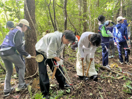 午前5時に起きて早めの朝食。7時には車4台で事務所を出て志賀町鵜野屋を目指す。能登空港ICのコンビニで飲み物を買うが、行列ができていました。解体や復興関係の仕事で現場に向かう方々が多い印象。裏道を通り市ノ坂に抜ける。車がほとんど通らない。鵜野屋の安成寺で学生諸君の到着を待つ。午前はヒアリング調査に向かう学生を弊社スタッフの車で運ぶ。楚和に行った際は、ちょうど年配の方が玄関先におられるのが見えたのでお話がうかがえそうであった。下鵜野屋については、住んでおられる家は無い状態でしたが、畑仕事に来ておられる方が見えたので、話をうかがいに行くように提案。戻ってきた学生さんに集落の状況を説明して回る。残っている建物は数軒あるものの、公費解体待ちの建物があり、4つの建物は残るようです。東洋大の学生諸君がいつも活動拠点にしていた研修センターも解体待ちとのこと。学生さんを連れて安成寺に戻り、昼は学生さんたちが作ったカレーライスをいただく。午後は1時過ぎに21名(計画では午前午後に分けて行う予定でしたが、午前は雨模様でしたので、午前チームもヒアリングに回り、午後にまとめる)の学生さんを連れて地保の裏山に上がる。住職にもご一緒いただきました。アテ林の手前のなだらかな場所を広げて休憩スペースを作る。アテ林の現状を見てもらい、下山。丁度3時で、迎えのバスが来ていました。当方も使わない長靴などを積んで、能登事務所に戻る。シャワーを浴びて、資料を準備。17時過ぎにセミナーハウス山びこに到着した龍谷大生を対象に30分程度お話をさせていただく。18時には終了。戻ろうとしたら、センター長に声をかけていただき、導入部で紹介した高峯了州氏の本を読まれているとのことでした。華厳経の研究書は現代でも読まれていると教えていただきました。本日は3人で夕食。早めに寝る。 | ![]() 地保の裏山で |