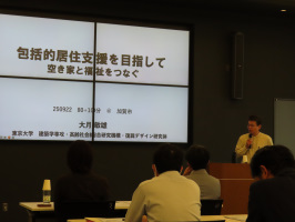 午前11時までに加賀に行き温泉駅近くの不動産会社で打合せ。午後1時からはクロスガーデン加賀で、「加賀市居住支援協議会」の設立総会と記念講演会がありました。協議会の委員として参加させていただきました。会長には社会福祉協議会会長の田中金利氏が選出されました。条例に基づいた正式な組織とのことで、令和9年9月21日限りと告示に記載されています。記念講演では、大月敏雄(東京大学大学院工学系研究科建築学専攻)教授が講演されました。住宅政策から居住政策への転換を図るのが2024年の改正された住宅セーフティネット法の主旨とのこと。今後の居住政策においては、ウエルビーイングの基盤としての住まいに何が必要かを明確にしていく必要があります。今回の協議会設立は法律により設置努力義務が定められており、それに基づくもののようです。モデル地区として松ケ丘と大聖寺を設定して新たな取り組みが推進されて参ります。具体的なことは今後の活動で明らかになって参りますが、まだまだ曖昧な点が多そうです。終了後、打合せを行いましたが、年度内の活動についても細部を詰めてゆきたい。 | ![]() 大月敏雄教授による記念講演 |