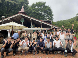 朝5時に金沢を出て能登事務所へ。7時前に到着、雨は上がっていました。太枝切鋏やノコギリ、蚊取り線香入れなどを積み込み、ケロンの小さな村に行く。龍谷大学の学生さんたちが到着する前に、蚊取り線香をいくつかセット。学生諸君が到着した時は雨が上がっていたので、早速二手に分かれて活動。拓夢さんが指導するチーム8人は、森の道整備を、私が指導するチームは水源への道整備を行う。まずは水源の一つである溜池まで歩き、溜池を紹介した後、周辺の道を広げる作業を行う。1時間半ほどして雨が落ちてきたので作業を終了。建物があるところに戻り休憩。森作業チームが戻り、米粉ピザを焼いていただく。12時前にはバスが出発し見送る。当方は能登事務所に戻り、道具類を下ろし、着替えて金沢に戻る。 | ![]() 記念撮影 |