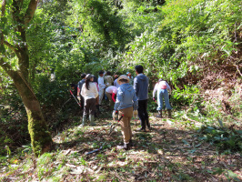 早めの朝食の後、金沢を出て能登へ。穴水のすしべんでおむすびとドリンクを購入。ホームセンターでも買い物をして能登事務所へ。着替えて、道具類を車に積み、ケロンの小さな村へ。上乗ファミリーはお揃いで、稲刈りの準備中でした。本日の稲刈り作業の現場を教えていただき、作業内容を確認。長靴を出して留学生たちの到着を待つ。11時15分には到着。まずはテントの中でオリエンテーション。早々に稲刈りの手伝いを開始。2つのグループに分かれて2つの田んぼで稲刈りの手伝い。珠洲道路沿いの田んぼでは、手刈りで稲を刈り終える。稲刈りのバイトもしたことがあるという学生さんがいて、2人が裸足でぬかるんだ田んぼに入り稲刈りをしてくれたので早かったです。13時前に終了。30分休憩し、午後は水源への道を広げる作業を全員で行う。溜池まで行き、主旨を説明、2手に分かれて作業を開始したのですが、最後は全員、林道を前進させる作業に取り組んでくれました。おかげで、5mほど前進、溜池が徐々に見えやすくなっています。15時過ぎまで作業を行い、テントに戻り、15時半からは上乗さんを囲んで振り返り。参加した留学生にも、上乗さんたちにも喜んでいただけて何よりでした。能海山市場とスーパーしんやで買い物をして事務所に戻る。 | ![]() 溜池そばので林道を先に進む |