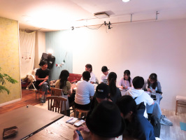 雨の中、8時半前に金沢を出て加賀に向かう。途中、小松の8号線沿いのパーキングに入り、車の中から移住希望の方と話をする。宝達志水町での地域おこし協力隊募集の件や移住体験の家などを紹介、早めに一度お越しいただくことを提案。加賀には9時半過ぎに到着、キミノスタジオ&カフェでの昭和女子大学の学生さんたちの活動に参加。オーナーの北山さんの話、KUTANI・KIMONOをプロデュースする山田さんとの質疑応答も面白かったです。ランチもいただきながら、さらに意見交換。学生さんたちは午後1時から畳のワークショップがあるとのことで出かけられた、ぶなの森チームは移住希望者さんと面談。移住コーディネーターに興味を持っていただいているようでした。 | ![]() キミノスタジオ&カフェでの活動 |
