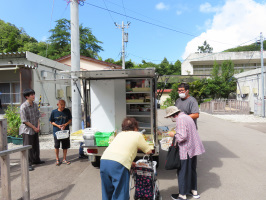 午前11時前に金沢駅に着いた東洋大生を出迎え、富来まで送り届ける。まずは富来支所にお邪魔し、富来学舎のカギを預かる。道の駅横の富来学舎に移動し、カギを開け、荷物を入れて、後は学生諸君に任せる。当方は能登事務所に移動し、本日帰る中央大の大学院生を見送るが、ちょうど、移動販売車が仮設団地に来たので一緒に様子を見に行く。何名もの住民が買い物に出て来られていました。彼は2週間ほどいたことになりますが、自動車を持たない方の移動手段の確保に関する論文が楽しみです。先に利用したシーツ類を洗濯をして干し、必要なものをメモしてから穴水に買い物に行く。本日は能登事務所泊。夜は涼しいので、エアコンが必要ないですね。 | ![]() 移動販売車 |