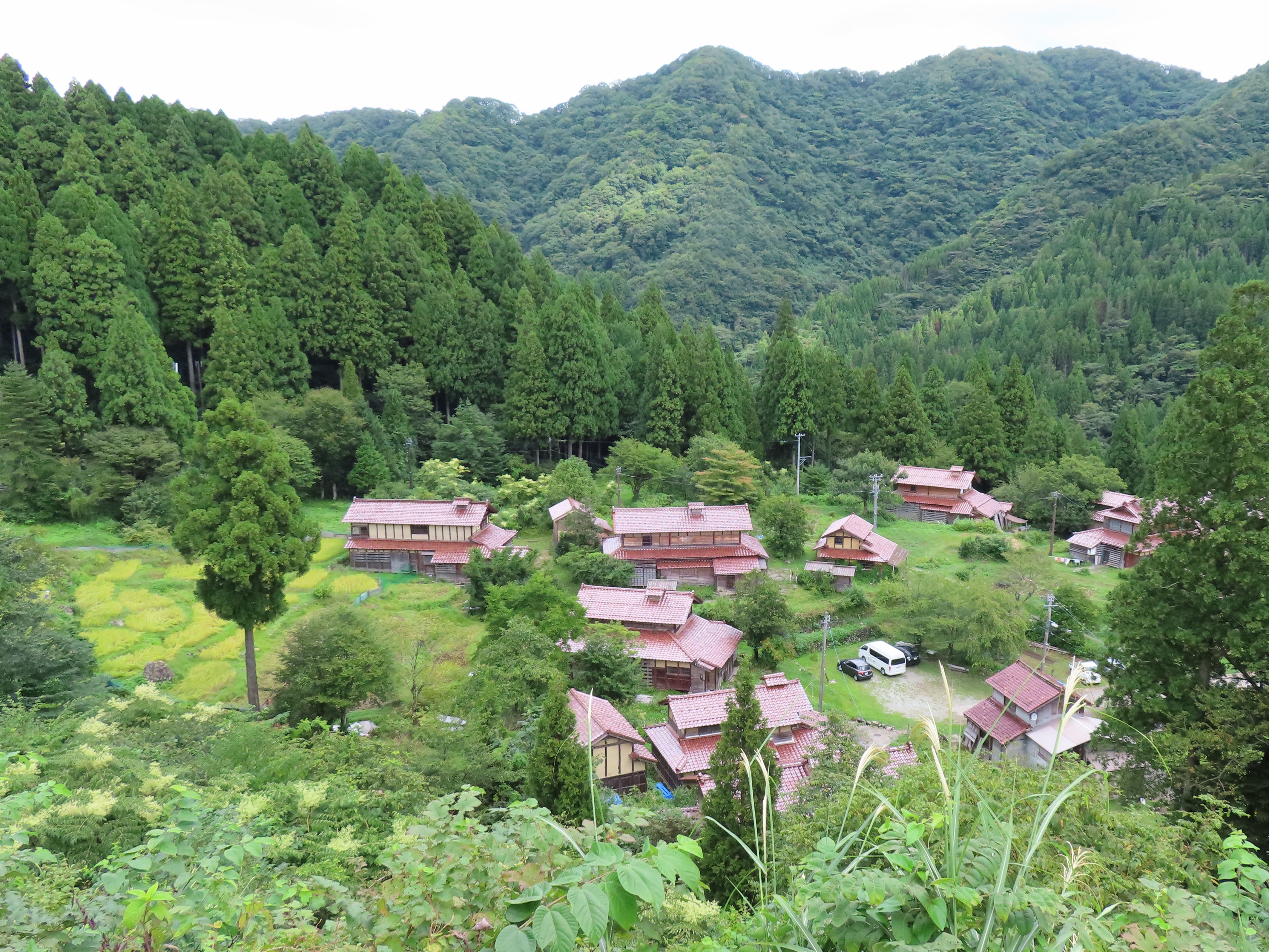 8時前に山代温泉のゆのくに天祥にお邪魔、インターンシップ参加の学生さんを案内。学生さんは旅館のマイクロバスで移動、スタッフ3名も別の車で同行され、我々は2名でサポート。まずは山中温泉の大土へ。二枚田さんにおつきあいいただき、集落を案内いただく。集落を見下ろすことができる展望スポットまで参りました。二枚田邸の中にも入れていただき、囲炉裏端で話をしていただく。国際ワークキャンプの学生さんたちがお越しでした。次に更谷富造さんのオークションハウスで話をうかがう。漆芸修復と作品づくりの話は奥深い。興味が無さそうな学生さんもいましたが。旅館に戻り、グループ分けをして、まずはランチ。午後は、旅行プランを作っていただきました。3時前には終了し、模造紙にまとめ、2つのグループから発表いただき、他のグループメンバーはスタッフから質問をしていただきました。最後にコメントさせていただき終了。我々は市民交流センターさくらに移動、新しいプロジェクトについての打合せ。 | ![]() 大土集落を見下ろす |