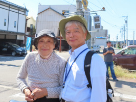 本日は、県内の留学生たちと珠洲市内を巡る。見附島からスタート、鵜飼地区を歩き、被災された方の体験談(地震で家が倒壊、長男夫妻と一緒にいて、3人が家の下敷きに。何とか脱出できたが、津波に遭遇、宝立小中学校に避難、翌日には親切な人の車に乗せてもらい、長男夫妻の家がある金沢に向かうが、能登空港近くでパンク、別の車に乗せてもらい金沢へ避難できた)をうかがい、本町ステーション訪問。鵜飼駅まで歩き、バスで飯田に移動し、飯田わくわく広場から中心部で行われていた富士宮やきそばのイベントを見学に、いろは書店ものぞく。イベント会場で「とんき」のおかあさん(92歳、店舗兼住宅を再建)と遭遇し、学生諸君とも交流いただきました。最後は道の駅すずなりで買い物をしてもらう。当方はバスで見附島の駐車場まで送っていただき、参加者の感想をうかがった上で見送る。バスに張り出されていた紙で事業名を確認、「外国人留学生地域交流推進事業」となっていました。 | ![]() とんきのおかあさんと |