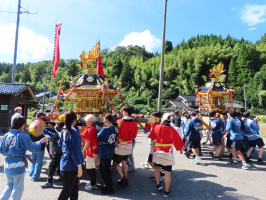 鵜野屋地保の祭りが催行された。スタッフたちには7時過ぎに出てもらい鵜野屋へ先に行ってもらう。当方は、10:50穴水駅到着の列車で来られた韓国の研究者を出迎え鵜野屋へ。11時半前に到着し、早速白髭神社での神事の様子を見学いただく。東洋大50名+金沢大の学生により神輿が担ぎ出され、白山神社へ。白山神社でも神事が行われ、こちらの神輿が担ぎ出され、二基の神輿が並んで巡行。上鵜野屋のバス停まで下り休憩。その後、鵜野屋のバス停まで巡行し休憩。地保の集落を巡行し、椎橋邸に神輿が入り神事。最後はおまつりひろばまで巡行し、神事の後で直会。ここで、先生より、女子学生を先生が預かった家に泊めることになったとの話があり、急遽、福地さんと増穂浦リゾートに行き、シュラフを引き取り、西海の家へ。カギを開けて、搬入し、網戸のついているところの戸を開け、エアコンのスイッチを入れる。先生と学生さんたちが来たところで我々は鵜野屋に戻る。福地さんには、加賀に戻ってもらい、当方は韓国の研究者を穴水駅までお送りして、能登事務所に帰る。 | ![]() 鵜野屋地保の祭り |