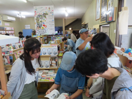 朝5時前に起き、本日の説明用の資料を作成。写真をセレクトし、出力しファイルに納める。9時前にセミナーハウス山びこに行ったら、すでに留学生たちはバスに乗車済みで、すぐに出発し珠洲へ向かう。まずは見附島の紹介をさせていただく。地震で激しく崩れているが、頂上エリアの木にも葉が再生し、島全体に緑が広がり、こんもりとした緑の島になりそうなことを伝える。のとじ荘の前の通りを歩くが、途中で立ち話中のお母さんたち4名に声をかけて話をうかがう。皆さん家が倒壊し仮設暮らしとのこと。それでも畑仕事に来られていて、皆さんが集まってこられるようです。震災とうじつの話をして下さった方は、先週に話をうかがった方の奥様でした。マンホールの土管が飛び出しているところも見学いただき、橋を渡って津波に会ってほとんどの家が無くなったエリアを歩く。プレハブで活動されている往環寺でもお話をうかがいました。鵜飼駅前でバスに乗り、飯田町まで移動。わくわく広場から中心部を歩き、いろは書店に立ち寄る。残念ながら先日、ご主人が亡くなられていますが、奥様も息子さんも明るく振舞っておられました。 最後は、道の駅すずなりで買い物。バス車中で感想を語っていただく。私は見附島まで送っていただき、そこで見送る。今回もめだか交通さんにお世話になりました。 | ![]() いろは書店で |