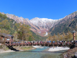 朝7時前に金沢を出て上高地を目指す。金沢大学の間の道を通り富山県に入り、福光ICから東海北陸道、中部縦貫道路を通り山へ。山から下道を通り平湯温泉へ、あかんだな駐車場に車を入れて9時10分前程でした。シャトルバスで上高地のバスターミナルまで行く。10時前に上高地到着。梓川沿いを河童橋まで歩き、ホテルの売店でおやきを購入。河童橋を渡り、太陽光の当たる川岸のテーブルでいただく。さらに、アップルパイの店で買ったパイとドリンクをいただき、上高地の雰囲気を楽しむ。大勢のお客様がお越しでした。少し下流側に歩いてみたが、家人は長距離を歩くのは難しそうだったので、引き返し、バスターミナルに戻り、早めのバスに乗って戻る。11時半前出発のバスも満席で補助席を使う程でした。12時10分頃にあかんだなに到着。平湯のバスターミナルの売店で買い物をし昼食をいただく。13時前に平湯を出発、途中の土産物店と福光の道の駅に立ち寄り、来た道を戻り16時前に金沢帰着。 | ![]() 河童橋 |