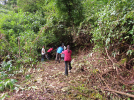 朝4時には起きだし、本日の資料を作成。8時にはケロンの小さな村に行き、昨日の鉢伏山での活動を踏まえての、ケロンの森へのブナ移植を提案させていただく。水源の森への道を広げる活動の記録もお渡しする。9時過ぎには、神戸学院大の学生さんたちが到着したので、長靴にはきかえてもらい、太枝切鋏とノコギリを持ってもらい、水源への林道を歩き、溜池のそばまで行き主旨説明。その後、少し戻り、先日の富山大附属中学生たちが作業した続きを行ってもらう。小雨が降っていましたが、楽しみながら作業を行っていただく。11時には作業を終えて戻り、ピザづくり体験。12時半からは、上乗さん、拓夢さんとお話をうかがう。14時にはバスで金沢駅に向かっていただきました。能登事務所に戻り、道具類を下ろして、休憩の後、金沢に戻る。 | ![]() 水源への道を広げる作業 |