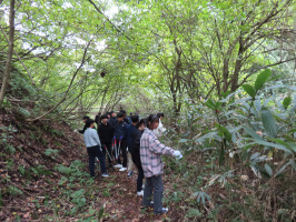 午後のための資料を作成し出力。9時には珠洲へ行き、富山大学教育学部附属中学生の修学旅行の午前のプログラムが行われる場所の確認のために歩いてみる。宝立地区を歩いている際に、副市長と遭遇。最初に立ち寄る予定の見附公園で待っていたが予定時刻を過ぎたので、宝立地区に移動し、本町ステーションで待機。11時前に、本町ステーション前にバスを止めて、中学生に下りてもらい、プログラムをスタート。バスは、本町ステーション近くの駐車場に待機。12時には終了し、見附公園に移動。当方は、見附公園で生徒たちが昼食を食べる準備している様子を撮影した後、能登事務所へ。滞在中の学生さんを伴い、ケロンの小さな村へ。太枝切鋏を下ろして、中学生が到着するのを待つ。14時前には到着したので、最初にオリエンテーションを行ない、上乗さんから話をしていただきました。その後は、水源への道を広げる作業をしていただきました。溜池を見学していただいた後、先日の留学生たちと広げた地点からケロン側に向けて作業を行う。最後は遊具で遊んでもらい、少しだけ質疑応答の時間を設けて終了。当方は、しんやスーパーで買い物をして、能登事務所に学生さんを送り届けて、金沢に戻る。 | ![]() ケロンの小さな村で |