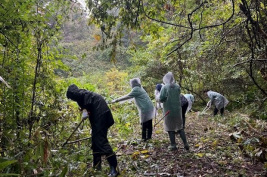 朝5時過ぎには家を出て能登へ。能登事務所で活動準備として、太枝切鋏と長靴を拭いて車に積む。軍手も数えて準備、蚊取線香も念のために用意し、早めにケロンの小さな村へ。事務所を出た9時半頃から雨が降り出す。ケロンに着いた後も徐々に雨が激しくなり、屋外活動も厳しいなと感じる程でした。本日は子どもたちのイベントが行われていて大勢の人がお越しでした。留学生たちが到着した11時過ぎには、雨が小降りになり、活動できるようになりました。長靴に履き替えてもらい、太枝切鋏やノコギリを持ってもらい、いざ水源への道へ。溜池のそばまで案内し、先日の続きをしてもらう。作業をはじめたら雨も上がり、合羽などをぬいで作業を行う。先に進むチームと戻る道を広げるチームに分けて作業を行いました。おかげで道が広くなりました。雨が落ちてきたので、作業を切り上げ、ケロンの中心に戻り、休憩の後、テントの中で上乗さんを囲んで話をうかがう。 | ![]() ケロンの小さな村で活動 |