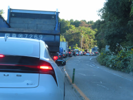 午前9時から県庁で打合せ。終了後すぐに能登に向かう。穴水のすしべんで昼をいただき、能登事務所へ。13時には相談希望者さんがお越しになり、いろいろ提案させていただく。3時前に事務所を出て、金沢に戻るべく能登空港ICからのと里山海道に上がり(15:18)、別所岳を過ぎてしばらく行ったところで動かなくなる。時々動き、対向車線に車が何台か通るのですが、あきらめた車がUターンしているようでした。ネットで調べたら(16:52)、事故で横田と穴水の間が通行止めになっているとのことで、当方もUターン。越の原ICで下りて、穴水駅近くの踏切を越えると、交差点で右折できないほど渋滞していたので直進、北國銀行があった交差点を右折し、穴水大宮前の交差点を直進、次の交差点まではのろのろでしたが、鵜島の交差点を右折すると、その先は中島まで信号がないのでスムーズに走れました。中島の道の駅なかじまロマン峠でトイレ休憩、横田インターからのと里山海道に乗ることができました。その時点では、まだ横田と穴水の間は通行止め。家に帰りついたのは19時前でした。 | ![]() 渋滞の様子 |