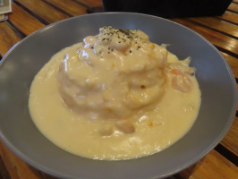 午前は滞在中の大学生と穴水町の七海屋でお話をうかがう。2024年元旦の地震では、営業中に地震が発生。酒瓶などが散乱し、途方に暮れる状況だったようですが、新潟の知人たちが片付けに来てくれて、5日から店を開けられたとのこと。早々に、昨日お話をうかがった久保さんから依頼があり、ペット関連用品の配布拠点として活動されています。奥能登一円から取りに来られていたとのことで、貴重な役割を果たされていました。その後、老眼鏡が沢山送られてきて配布したり、カーシェアリング協会の車の貸出拠点にもなられています。弊社スタッフを利用させていただいていました。午後は能登町のPEACEライダーズマリンベースに移動し、遅いランチをいただき、大場さんからお話をうかがう。震災後、ペットレスキューの活動を続けられています。お店にもネコがいてお客様に愛されている感じです。帰りには宇出津によりカクダストアで買い物をしてもらい能登事務所に戻る。当方は一旦金沢に帰る。 | ![]() PEACEでいただいたホワイトソースのシーフードオムライス |