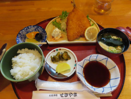 昨晩に届いていたメールに返信し、別のメールの添付ファイルを出力。朝食を食べた後、柳田の北能産業のガソリンスタンドで灯油を購入。午前は能登町定住促進協議会で森さんから学生に話をしてもらう。その後、珠洲まで足を伸ばし、市役所そばのせきやまで早めのランチ。海の近くの道を走り見附島へ。鵜飼地区のネコのいる場所も訪ねたら、奥様もおられて少しだけネコについて話をうかがうことができました。恋路海岸、松波経由で不動寺へ。おくのと市で買い物をした後、山口地区の集会所やその向かいの密教寺院を拝見。午後1時からは不動寺公民館で新谷館長から話をうかがう。ケロンの小さな村にお邪魔して、明日の活動について相談。しんやスーパーで買い物をして戻り、明日の準備をしてから夕食。 | ![]() せきやまのアジフライ定食 |