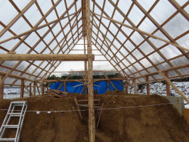 昼前に白山さんへゆき、正月のしめ飾りを預ける。明日が左義長ですが、本日から駐車場で受け付けていて、竹で組んだ下に積み上げられてゆきます。早めの昼食をいつもの善与門でいただく。その後、イオンモール白山へ移動。松が丘のチャレンジショップのトイレ改修をお願いしている設備屋さんに鍵を渡す。買い物をして戻り、休憩の後、東原へ。前田さんから炭を購入。建設中の炭窯を見せていただく。屋根が高く安全な印象です。窯はこれから作られるようですが、穴だけは重機で掘っていただいてあります。完成が楽しみです。夕方は生協連さんとのオンラインミーティング。能登の復興支援のための情報発信活動に取り組んでいただいていて、原稿制作の一部をお手伝いしております。 | ![]() 前田さんの炭窯 |