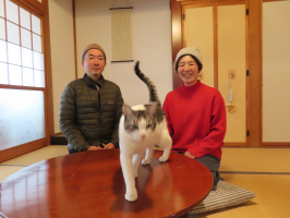 9時半過ぎには買い物に行き、すぐに宝達志水町へ。暮らし体験の家でスタッフと合流し、近くの移住者さんのところへ。空き家を購入し、ゲストハウスをされている西夫妻に話をうかがう。2軒運営されていますが、今の時期は能美市で運営されているゲストハウスにお客様が多いとのこと。宝達志水町の家はDIYで整備され、お客様が滞在しやすいようにされています。保護ネコを2匹飼っておられるので、ねことのふれあいを楽しみに来られるお客様も多いようです。昼食を志お食堂でオムライスをいただき、暮らし体験の家でパソコン仕事を。14時過ぎには西さんたちが始めたコミュニティカフェわにもお邪魔してお話をうかがう。ちょうど、移住してきて農業に取り組む二人が来店。4年前に移住した小早川さんと昨年移住された丸川さん、よいタイミングでした。 | ![]() 西夫妻、ゲストハウスちりんで |