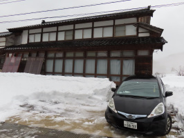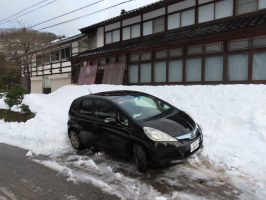 8時半には金沢を出て能登へ。穴水で買い物をして能登事務所に到着したのは11時過ぎでした。穴水では、JAの直売所で星野さんの豆腐などを購入。どんたくでも買い物をしたので少々時間がかかりました。能登事務所についたら、すぐに雪かき。しばらく、車を仮設団地に止めさせていただき、事務所前に車1台分のスペースを空け、車を移動させる。その後はじっくり作業を続ける。車をバックで止められるようにして昼食休憩。午後も作業を続け、2台分は確保しました。事務所に入るための通路にも雪が入っていたので、雪をどかして歩きやすくしました。4時過ぎまで作業を続け、さすがに疲れたので終了。お風呂に入り、スーパーしんやまで買い物に出掛ける。本日も炭を起こして楽しませていただいております。 | ![]() 車2台分を空けた能登事務所 |