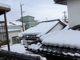 7時には、息子と二人で起きだし雪かきを行う。この冬初めてのこと。20センチ以上は積もっていたので、駐車場への出入りがしやすいように、道路の雪を近くの用水に流す。水量は少ないが、裏の道路まで流れれば、暗渠となっている深い用水に落ちていくので、水があふれる心配はないので、助かっています。昼にはお餅をいただき、午後には、郵便局で年賀状を追加で購入、ケーキと灯油を買って戻る。寒くなったので、灯油の減りが激しい。雪かきで疲れたので、甘いものが欲しいとのことでケーキをいただく。年賀状を出しにいった帰りに買い物をして戻り、新たに料理を作り、早めに夕食を食べて寝る。 | ![]() 雪が積もったお隣の屋根 |