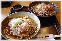 | 7月17日(木) こはく庵 昼は福井でおろしそばをいただく。「こはく庵」(福井市門前2丁目830 TEL0776-35-5508)という店に連れていってもらう。平たいきしめんのようなそばですが、色とか味は越前そばらしい感じです。大根おろしもからくなくて食べやすい。2枚頼むが1枚の量がそれなりにありました。器がすべてちがうデザインで、金津で創作活動をされている方の作品とのことです。帰りぎわに見つけたのですが、鯖の丸焼きも美味しそうでした。福井の中心部から見ると、足羽山の裏手にあります。営業時間は11:00〜18:00、日曜定休ですが、そばがなくなると閉まることもあるようですから、遠方から行かれる際は、念のためnに事前に電話したらよいですね。 | ![]() こはく庵のおろしそば |