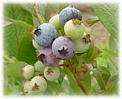 | 7月15日(火) ブルーベリー 昼から能都町に行くが、途中柳田村の植物公園の前にある柳田食産にお邪魔して、ブルーベリーを注文する。注文が多くて、商品が足りないとのことでした。すぐそばのブルーベリー園でもブルーベルー狩りを体験できるとのこと。モデル農場に比べて木は小さいが、実は熟してきています。今月中は大丈夫そうです。ちなみに、実験農場は7月25日までとなっています。ただし、平日は2日前までに予約して下さい。モデル農場は柳田村字当目1字205-4、穴水から珠洲に向う道路の途中に看板が出ています。TEL 0768-76-0014。大人1,000円、小学生500円です。開園時間は9:00〜15:00。能都町に富山の上市町商工会の方々が視察にお見えでしたので、一緒に「まんなか市」の様子を見て回る。夜はまんなか市の次回以降のことについての会議。9月までのフレームをまとめる。 | ![]() 木に実ったブルーベリー |