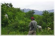 | 7月5日(土) 森づくり2003夏 石川の森づくり2003夏の草刈り。天気もよくて絶好の活動日和でした。遠くに白山も眺められ、60人程の参加者と一緒に汗を流しました。10年目になる活動もこれからが正念場です。植えた樹木が森らしくなるためには、あと10年ぐらいはお世話に来ないと草に負けそうです。根気よく継続して活動してゆきたいもです。徐々に参加者も増やしながら。 | ![]() 白山を眺めながら草刈り |