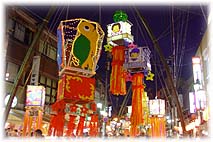 | 7月21日(月) 福光ねつおくり七夕まつり 夕方から福光のねつおくり七夕まつりを見に行く。大きな七夕飾りが印象的であった。孟宗竹を何本も束ね、それを四方からひっぱり、その先端に飾り物を吊るしてありました。道路を歩く通行人が触れる位置まで下げてありますので、相当な重量がある。屋台も多くて、人出もきっとこの辺りの夏祭りの中では最も多いのでしょう。今回、町をぶらぶらしての大きな発見は、裏通りが極めて複雑に出来ていることです。井波の裏通りも凄かったですが、福光はそれを上回っています。メインストリートの裏は迷路のように細い道が縦横に走る。川の近くの飲食街も不思議な雰囲気でした。「ねつおくり」の原形的な民俗も見てみたいものです。 | ![]() 大きな七夕飾り |
