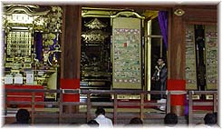 | 7月27日(日) 太子伝会 昨日は、城端・善徳寺の虫干し法会と井波・瑞泉寺の太子伝会を見に行く。同じ時期に行われている。宝物の虫干しを兼ねて、その解説を行っている。善徳寺では山門の上に上がることも出来ます。お寺の各所に宝物が展示され、関係者が一つ一つ解説して下さるところがいいですね。解説させる方の個性があって面白い。瑞泉寺の太子堂では聖徳太子の絵伝の解説が行われます。本堂でもおつとめが行われていました。絵伝の古いものは宝物館に展示されていました。ここでも解説が聞けるとさらに良かったかもしれませんね。夜は商店街や交通広場で観光祭が行われ、屋台や大道芸などもでて、遅くまでにぎやかでした。彫刻の町らしく、氷の彫刻展も行われ、きれいでしたね。 | ![]() 太子堂での絵解き |