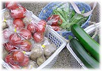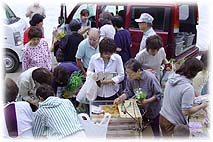 | 7月13日(日) 湯座屋市 山中温泉の湯座屋市を見学に行く。総湯の横で、朝7時から始まる。6時過ぎには山中についたので、ゆげ街道を散策、ますます整備が進み、入ってみたいと思わせる店が増えていた。家や店の前に緑が多くなり、潤いのある雰囲気を醸しています。6時45分に総湯がはじまり、市もお客さまが取り巻きはじめ、あきないが始まる。1時間程度みていましたが、地元の高齢者を中心に観光客も結構みられました。温泉コーヒーや温泉まんじゅうなどもあり、その場で飲食できるようにテーブルと椅子も用意されているところがよい。たくさん販売していた柿の葉寿司や炊き込みごはんなども試食できるとさらによいのだが。元気な商店街や旅館の女将さんたちが楽しんでやっているという感じです。農家の人も車の荷台に野菜を積んでもってきていて、市らしい感じになっています。月1回第2日曜日だけというのがもったいない。毎週日曜日の朝にやっていただければ、観光のお客さんも楽しみにできるのですがね。帰りに叔母さんのところに寄り、叔母さんを金沢のお寺と親戚に案内し、夕方までおつきあい。 | ![]() 賑わう市 ![]() 美味しそうな野菜 |
