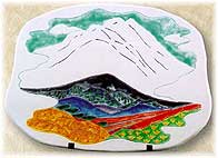 | 9月28日(日) ふるさと百名山 「ふるさと百名山」完成祝賀会がホテル百万石で行われる。加賀市大聖寺出身の深田久弥が書いた『日本百名山』にちなむ企画である。今年は深田久弥の生誕100年。日本百名山をベースにしつつ、全ての都道府県の山が入るように選ばれたふるさと百名山です。宿泊施設のホテル百万石に相応しい事業であります。北海道や長野県のように広い所はいくつも入っています。複数の県にまたがっている山もありますね。1点1点が作品であり、全体で一つの作品とも言えます。10月5日まで記念展と個展が行われています。 | ![]() ふるさと百名山の由布岳 |