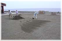 | 9月4日(土) 分科会後編 朝6時に集合してたことり体験へ。実際にたこがとれる瞬間に立ち会う事ができました。島根から参加の太田さんがたことりに成功。運が良かったです。朝食の後、輪島の分科会二つを見学。真剣に議論が行われそうな雰囲気でした。能都町にもどり、さんなみで、魚の美味しいまちづくりの分科会の最後の昼食をご馳走になる。さすがに、さんなみの食事は贅沢でしたね。朝とれたたこも茹でていただき、はさみで切り、能登の塩をつけていただきました。散会後、島根の太田さんと珠洲に向かう。しいたけ小屋ひろ吉さんで安心院から来ていただいた中山ミヤ子さんと合流。メロンをご馳走になってから、塩田村を訪ねる。珠洲の分科会に参加されていた館長もいらして、説明していただけました。にがりと塩を購入。応接室でコーヒーをご馳走になるが、塩を少しだけ入れてあり、おいしく感じました。輪島の朝市通りで塩せんべいを買い、門前へ。手仕事屋で星野さんと話していただき、森ますで刺身と寿司をご馳走になる。まんだら村の「能登の自然学校」に泊めていただく。 | ![]() 塩田に砂をまく |