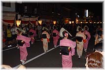 | 9月1日(水) 風の盆 風の盆本番です。平日ということもあって、お客様の数は少ない。スポーツアリーナ駐車場でも、無料シャトルバスにすぐ乗れましたし、観光会館周辺の人も少ないように感じました。事務局での話しも、3日の問合せは多いが、2日もきっと少ないのではないかとのことです。それでも、諏訪町通りは人が多かった。所々で胡弓の演奏を聞かせて下さる方がいらしたが、いい趣向でした。一線から退かれた方々に自宅や公民館等で胡弓や三味線の演奏を聞かせていただけるだけでもよい。観光協会としても、積極的にお願いしてはどうか。踊りを見たいというお客様も多いが、風情を味わいに来られている方も多いので、それだけでも十分です。これだけのお客様がお越しになられているのですから、総合的な演出が必要ではないか。ステージをいくつかのところに設けてあるので、そこでおわらをきめ細かく行うことも期待されます。街全体をステージに見立てたおわらの楽しみ方を考えたい。 | ![]() 西新町での町流し |