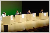 | 9月3日(金) 地域づくり団体全国研修交流会 第21回地域づくり団体全国研修交流会の全体会と分科会。基調トークは「持続可能な地域づくり」がテーマ。スローライフジャパン理事長の川島正英氏をコーディネターに、遠野の菊池新一さん、四万十ドラマの畦地履正さん、さわやかいいね金沢の中野啓子さんがパネリスト。1時間半弱の時間では限られた議論しか出来ませんが、昼食を挟んでの打ち合わせ、話し合いの中で出たことは一通りお話いただきました。事前の話し合いも重要ですね。分科会の様子をあちこち見て回るが、門前では総持寺の板橋住職のお話をうかがうことができましたし、柳田村では正部家さのお話も少しばかり聞けました。さすがにお客様をつかまえるのがうまい。最後は能都町の分科会の懇親会に参加。遅くまで議論はつきませんでしたね。 | ![]() 基調トーク |