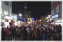 | 9月15日(水) 歩行者天国 能都町の歩行者天国の様子を見に行く。夜になるとさすがに人が多かった。平日ということで、お客様が集まるのか不安であったが、ステージ前の道路にはざっと見ても500人以上の人が集まって来られていました。MROラジオの公開録音ということもあり、集まりやすかったのでしょうが、15年間続けている事業でもあり、年に一度の楽しみという意味もあるのではないか。高齢者だけでなく、若者たちもスーパーの前に集まってきていた。このような場を必要としているのでしょうね。民宿ふわに戻る際に、港のそばを通ったが、魚で海面が動きうるさいくらいであった。海産物の豊富なところは違います。 | ![]() ステージ前の人だかり |