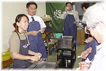 | 9月30日(木) 郡上八幡 キャラバン2日目、郡上八幡に行く。台風も通過し、徐々に晴れてきた。最初に、郡上八幡旧庁舎記念館でお話をうかがう。2階の大広間では郡上踊りの体験が可能なようになっている。その後、博覧館まで歩き、郡上踊りの実演を拝見。施設のスタッフの方が解説しながら踊って下さいました。さらに、ガイドの方についていただき、町歩きを楽しむ。新橋亭で飛騨牛をいただいた後、サンプル工房でてんぷらづくりを体験。9割が観光収入というサンプル工房はいいモデルです。体験も年間で5000人ぐらいが来られるとのこと。一般のお客様から見えるところで体験を行うところもみそかもしれない。意欲的に頑張っている人がいることがよく分かりました。最後にお邪魔した「門」という名の喫茶店の女将さんも永年まちづくりに取り組んで来られた方でした。ポジティブな方の存在が地域の魅力を形成する大きな要素ですね。郡上八幡と五箇山、八尾をつなぎ民謡のネットワークを形成することをもっと積極的に行ってもいいのではないか。すでに通年で体験が可能なようにはなっていますので、お客様にコースを組んでもらいやすいように情報をきめ細かく出すことです。 | ![]() 郡上おどりの実演 ![]() サンプル工房での体験 |