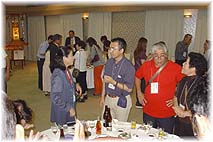 | 9月2日(木) 前夜祭 本日から地域づくり団体全国研修交流会がスタート。今日は穴水で前夜祭。穴水のキャスル真名井で、6時から開催。分科会からも料理を提供いただきました。終了後、明日の基調トークのコーディネーターをお願いしている川島正英さん、スローライフジャパンの野口智子さんと江戸っ子寿司へ。早めに帰り、寝る。明日が全体会と分科会、最終日の4日は分科会の続きです。どのような出会いがあるか、楽しみです。ほとんどの都道府県からご参加いただけます。新たなネットワークづくりのきっかけになるのは確か。基調のテーマは「持続可能な地域づくり」。環境との関わりでの持続可能性・不可能性、事業・活動の持続性、そして、次代へつなぐ仕組みやコンセプトを生み出すこと。そのようなことを柱に議論を深め、新たな地域知の創造を目指したい。4日は安心院の中山さんたちと門前に泊まり、いろんなお話ができればと思います。 | ![]() 前夜祭で交流する |