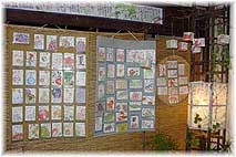 | 10月9日(土)坂のまちアートin八尾 台風の影響で雨が降る中、坂のまちアートin八尾を見に行く。金沢美術工芸大学の学生諸君が滞在しながら、住民も巻き込んで作品制作をしてくれた駅前の福島(ふくじま)地区にまず行く。駅舎の中やまわりにも作品が展示されていて、普段とは異なる姿になっていた。もっと作品があってもよいくらい。駅の方々の参加もあってよい。電車で通った時に印象に残るような作品があるとさらによいね。駅のホームに野の花を活けることがもっとほしい。駅前通りの商店では野の花を活ける店も多く、新たなお客様と出会うきっかけづくりになるはずです。マップには入っていない店のショーウインドをのぞいたら、まんだらが展示してあった。説明に出てこられた女将さんいわく、息子さんがインドで求めてこられたまんだらと、むすこさんが描かれた作品とのこと。店内には息子さんが創られたという彫刻作品も置いてあったので、傾いた椅子の作品を店前に出させていただいた。説明を付けていただけるとさらに分りやすくなりますが、女将さんが説明されるのもそれはそれでよい。燃料品店さんの絵手紙展は女将さんが自ら絵手紙を創られているので、いろんな絵手紙が届くようだ。駅前通りが歩いて楽しい通りになれば、JRで八尾にやってきて、旧町まで歩いて行く人がもっと増えるであろう。このような事業はまちの新しい表情をつくるよいきっかけになります。個々のお店のディスプレイをいかに変えるかを相談して回るような活動もあるとよい。普段と異なる印象を与えることができれば、地元の人ものぞいて見たくなりますし、外からこられたお客様にもアピールできるはずです。雨が降り続いていましたが、ぶらぶら歩いているお客様も多く、たいしたものです。 | ![]() まんだらと彫刻作品のある店 ![]() 花を飾られた食料品店 ![]() 店内いっぱいの絵手紙 |
