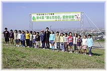 | 10月17日(日) 森づくり 金沢の郊外、大乗寺山で行われた森づくりに参加。晴天に恵まれ絶好の日和でした。会場は眼下に金沢市街や遠く日本海も望める高台です。最初にしらいみちよさんのミニコンサートもありました。子供達と「地球にかえろう」も唄って下さいました。この曲は愛知万博のフィナーレでアジアの子供達と一緒に唄われるとのことです。植樹は狭いエリアに少ない本数の苗木を植えましたので、すぐ終わりました。しらいさんが植え続けている桜も10本植えました。阪神・淡路大震災で亡くなった方々の鎮魂のために、6500本を目標に桜を全国で植えています。すでに5300本以上植えられたようです。しらいさんは、火曜日には能都町の数馬酒造で酒蔵コンサートを行われ、金曜日には市民芸術村でコンサートが予定されています。 | ![]() 子供達と一緒に唄うしらいみちよさん |