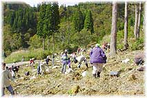 | 10月23日(土) 森づくりin白峰 白峰村の西山地区で森づくりの植樹を行う。ブナ、ミズナラ、トチを植えた。参加者も多かったので1時間程度で終了。それでも、天気が良かったことと、土地が荒れていたので、汗をかきました。事前に穴を掘っていただいていても、それなりに大変です。一番最初に白峰で植えた時は穴を最初から掘ったので大変であったことが思い出されます。作業の後、白峰で最初に植えた場所や今回植えた所よりさらに上にある数年前からブナ等を植え続けてきたところも見てきたが、相当大きくなっていました。森と言えるようになるにはまだまだ年月がかかりそうですが、気長に草刈りに行くことが大切ですね。帰りに、鳥越村の出合の道の駅で行われている「ふれあい市」をのぞく。地域の人々が手づくりされたものを販売されています。一角にはそばを食べることができる店もありますので、それを目当てに来ているお客さんも多い。ふれあい市は明日もあります。昼食は近くにある脱サラでそば屋を始めた「おきな」(TEL 0761-94-2775)でそばをいただく。月曜日の勉強会に参加いただいていました。唐変木の橋本さんに教わったそばはきれいでした。集落の中にあって分かりづらいが、店の中は落ち着いた雰囲気で心地よい。 | ![]() 大勢で植樹 ![]() おきなのそば |