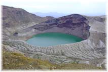| 10月16日(土) 蔵王 最後のプログラム、現地見学会で蔵王に行く。寒かったが、頂上付近は雲もなくて、火口湖「お釜」を存分に見る事ができました。裏側からも拝見させていただきましたが、そこからの眺めも素晴しかった。2本の滝があり、紅葉した森が一層映えてみえました。ライザレストランで釜飯をいただき、クロスカントリーコースの森を散策する。ライザレストランはスキー場に併設されたレストランですが、メニューを充実させることで、蔵王の訪れる観光客の格好の昼食処になっています。家族連れで遊びに来ている人もいましたから、通年でお客さんに来ていただくためには重要な施策ですね。クロスカントリーコースも同じ事が言えます。冬場以外でも散策コースとして活かすことを促進すればよい。最後は農産物直売場をのぞく。珍しくなつめを売っていたので、試しに購入して、下田の楠山さんたちとかじってみたが、懐かしい味がしました。かみのやま温泉駅まで送っていただき、駅前で運営スタッフの皆さんと最後のご挨拶。上山で目にした不思議な風景の一つが、たんぼの中の藁積みの林立。柱にからめて藁が積んであります。地域によってちがいますね。 | ![]() 蔵王の火口湖「お釜」 ![]() わら積み |